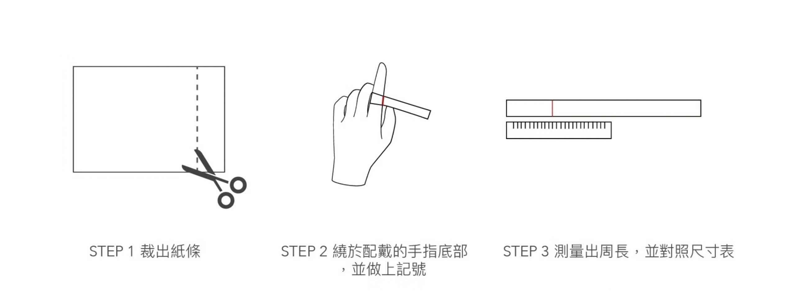 特別注意的是,如果戴上去會稍微壓肉,不好脫下,那就表示這個尺寸太小了;反之,能夠輕易脫落就表示這個尺寸過大。